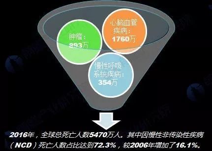 根據(jù)2016全球疾病負(fù)擔(dān)研究(Global Burdenof Disease Study 2016,GBD)公布的數(shù)據(jù)顯示,2016年全球總死亡人數(shù)為5470萬人,其中死于慢性非傳染性疾病(NCD)人數(shù)占比達到72.3%,總?cè)藬?shù)為4004萬人。2016年慢性非傳染性疾病(NCD)死亡人數(shù)較2006年增加了16.1%。 2016年,造成最多死亡人數(shù)的三類死因為:心腦血管疾病-1760萬;腫瘤-893萬;慢性呼吸系統(tǒng)疾病-354萬。